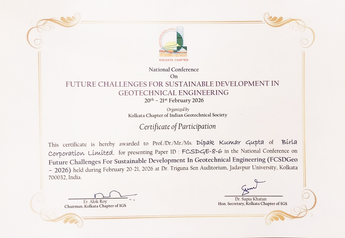 Mr Deepak Kumar Gupta, General Manager, Marketing, Birla Jute Mills, presented a paper titled “Jute Geotextiles-A Low Cost Innovative Technology for Ground Improvement in Civil Engineering Works, with Some Case Studies,” at the National Conference on “Future Challenges for Sustainable Development in Geotechnical Engineering”, organized by the Kolkata Chapter of the Indian Geotechnical Society, at Triguna Sen Auditorium, Jadavpur University, Kolkata, during 20-21 February 2026.
